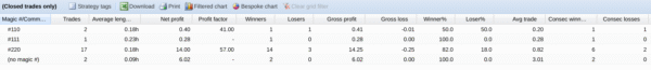 In the STATS section of FXBlue, I can list the statistics by strategies and I see all the necessary information about them.