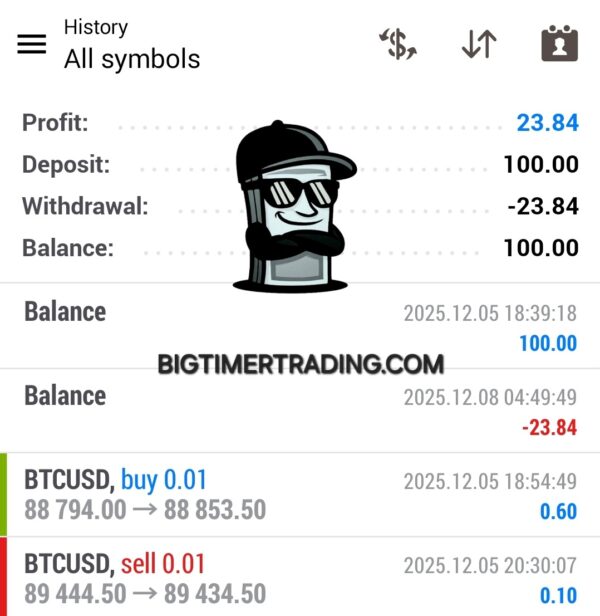 The account closed $23.84 profit during the test period, which is 23.84% profit.